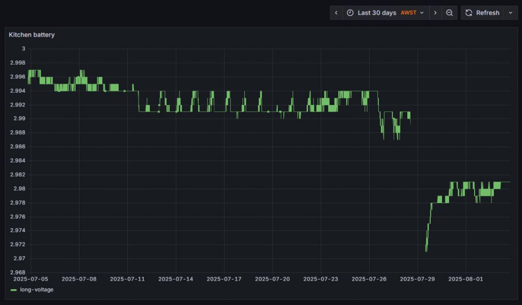 I had been re-purposing some of my PCB’s and set one up for testing. Nothing special, just an ESP12S, a ATtiny1614 companion processor, a few passive components and a DS18B20 one-wire temp sensor. I was going away for a week and wanted to leave it running and see how it behaved. I hunted around home for a battery holder and batteries and the only holder I could find was for 2xD-cells so I bought two new Energizer D-cells, hooked it up and hung it from a small nail on my kitchen wall.
