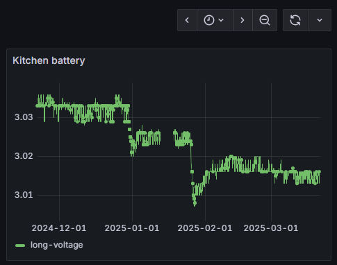 I am interested to see how low the battery can go and everything keeps working. I guess the DS18B20 will quit first as the data-sheet says 3->5.5V working. This is for the device to meet spec (-55 to +100 deg-C) so its probably going to work for a while yet but perhaps not meet spec for the whole range.